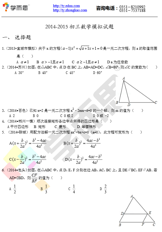 2014-2015年九年级期中考试数学模拟试题二(2)