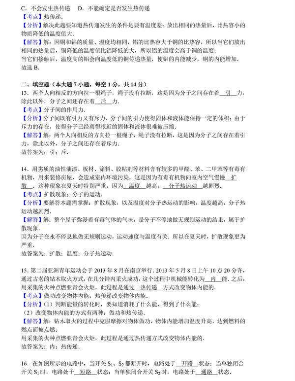 北辰双语2016-2017学年初三上月考物理答案(5)