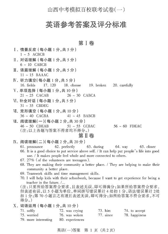 2018年山西省中考模拟百校联考(一)英语答案(4)